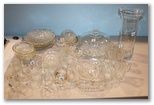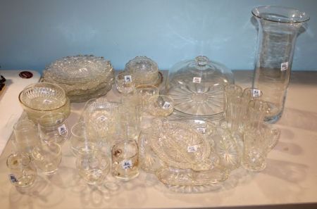 Large Group of Clear Glass; including trays, cake plate with top, bowls, and a large clear vase inscribed AB ALCOA 1950-1982 14" h. Large Group of Clear Glass; including trays, cake plate with top, bowls, and a large clear vase inscribed AB ALCOA 1950-1982 14" h.