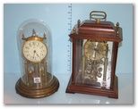 Two Mantel Clocks; one brass clock with glass dome stamped Kundo 12 1/2" h., and one brass clock in mahogany wood case marked Pennsylvania House 14" h. Two Mantel Clocks; one brass clock with glass dome stamped Kundo 12 1/2" h., and one brass clock in mahogany wood case marked Pennsylvania House 14" h.