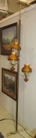 Three Tier Tension Pole Lamp; with amber tone glass shades Three Tier Tension Pole Lamp; with amber tone glass shades