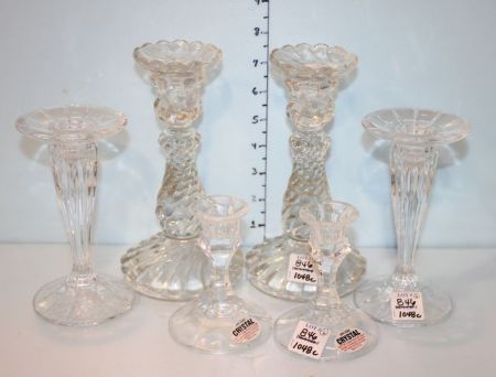 Three Pairs of Crystal Candlestick Holders; largest pair has chip (ranging from 8" h., to 4" h.) Three Pairs of Crystal Candlestick Holders; largest pair has chip (ranging from 8" h., to 4" h.)