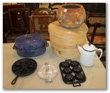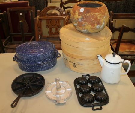 Group of Various Kitchen Items, including; cast iron corn bread pan, cast iron muffin pan, cast iron press, granite coffee pot, two wooden cheese boxes and a terra cotta planter Group of Various Kitchen Items, including; cast iron corn bread pan, cast iron muffin pan, cast iron press, granite coffee pot, two wooden cheese boxes and a terra cotta planter
