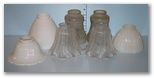 Group of Seven Glass Shades; two matching etched glass shades, two matching etched glass shades with ruffled edges, and three variously sized milk glass shades Group of Seven Glass Shades; two matching etched glass shades, two matching etched glass shades with ruffled edges, and three variously sized milk glass shades