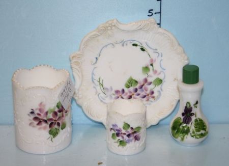 Four Piece Milk Glass handpainted with Violets , Toothpicks, and Dresser Pieces Four Piece Milk Glass handpainted with Violets , Toothpicks, and Dresser Pieces