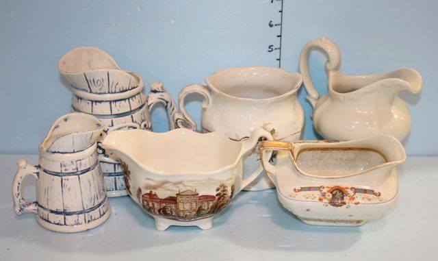 Group of Pitchers and Creamers, including; Johnson Bros creamer, two hand painted creamers, Rosenthal Creamer, small butter pitcher, syrup pitcher Group of Pitchers and Creamers, including; Johnson Bros creamer, two hand painted creamers, Rosenthal Creamer, small butter pitcher, syrup pitcher