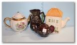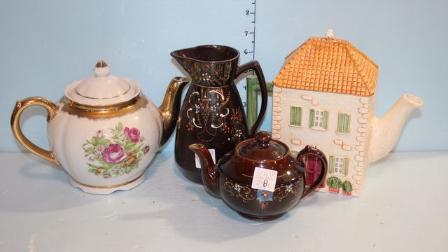 Three Tea Pots and a Hand Painted Creamer; Gold Trimmed tea pot, cottage shaped tea pot, small hand painted tea pot, hand painted creamer (cracked) Three Tea Pots and a Hand Painted Creamer; Gold Trimmed tea pot, cottage shaped tea pot, small hand painted tea pot, hand painted creamer (cracked)