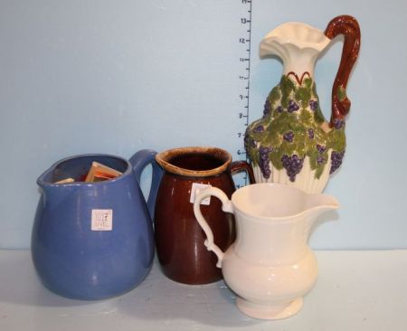 Group of Pitchers, including; blue stoneware pitcher full of match books, brown stoneware pitcher, china pitcher, Arnels grape tall pitcher Group of Pitchers, including; blue stoneware pitcher full of match books, brown stoneware pitcher, china pitcher, Arnels grape tall pitcher