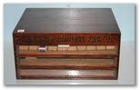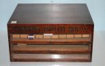 Hemingway and Bartlett Silk Company Three Drawer Wooden Thread Cabinet; 16 3/4" w., 8 1/4" h., 13 3/4" d. Hemingway and Bartlett Silk Company Three Drawer Wooden Thread Cabinet; 16 3/4" w., 8 1/4" h., 13 3/4" d.