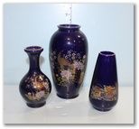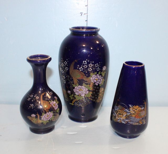 Three Oriental Peacock Motif Vases, marked Japan; 6 1/2", 5 3/4", 5 1/2" h. Three Oriental Peacock Motif Vases, marked Japan; 6 1/2", 5 3/4", 5 1/2" h.