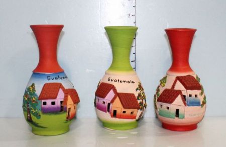 Three Pottery Vases, "Guatemala", hand painted with cut out designs 6 1/2" h. - 6" h. Three Pottery Vases, "Guatemala", hand painted with cut out designs 6 1/2" h. - 6" h.