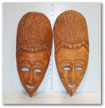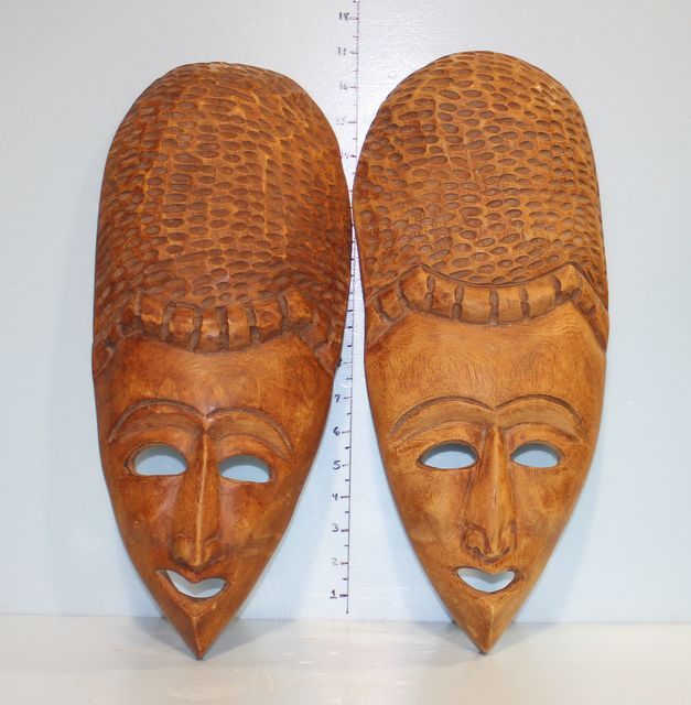Two Wood Carved Masks, area on back to hang as wall plaques; 18" l. Two Wood Carved Masks, area on back to hang as wall plaques; 18" l.