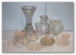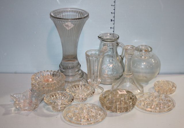 Group of Fifteen Clear Glass Items, including; four pen holders, three matching candle holders, two matching candle holders, two other candle holders, three vases, one pitcher Group of Fifteen Clear Glass Items, including; four pen holders, three matching candle holders, two matching candle holders, two other candle holders, three vases, one pitcher