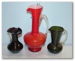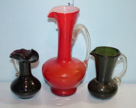 Three Art Glass Pitchers; red 8 1/4" h., green 4 1/2" h., purple 4" h. Three Art Glass Pitchers; red 8 1/4" h., green 4 1/2" h., purple 4" h.