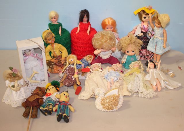 Four Porcelain Face Baby Dolls along with Large Group of Other Dolls, including; two dolls with hand crocheted skirts, two wooden dolls and fourteen others Four Porcelain Face Baby Dolls along with Large Group of Other Dolls, including; two dolls with hand crocheted skirts, two wooden dolls and fourteen others