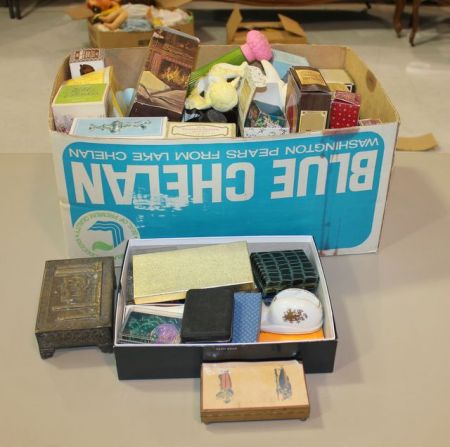Large Box of Avon Collector Bottles along with Costume Jewelry and Trinket Boxes; approximately 40 bottles) Large Box of Avon Collector Bottles along with Costume Jewelry and Trinket Boxes; approximately 40 bottles)