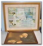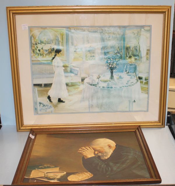 Two Prints; print on board of man praying 22 1/2" w., 18" h., framed print of a tea party (has water damage) 31" w., 25" h. Two Prints; print on board of man praying 22 1/2" w., 18" h., framed print of a tea party (has water damage) 31" w., 25" h.