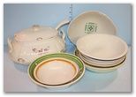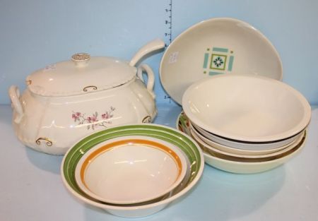 Group of Bowls and Soup Tureen; eight miscellaneous china bowls, soup tureen with ladle (has chips) Group of Bowls and Soup Tureen; eight miscellaneous china bowls, soup tureen with ladle (has chips)