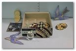 Group of Various Glassware Items, including; eight stained glass and plastic sun catchers, three mirrored small disks, small lead crystal covered box with butterfly, two small glass angels Group of Various Glassware Items, including; eight stained glass and plastic sun catchers, three mirrored small disks, small lead crystal covered box with butterfly, two small glass angels