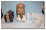 Group of Various Dishes and Ceramic Items, including; clear hen on nest covered dish, large blue and white salt and pepper shakers, oil and vinegar bottles, basket weave ceramic cookie jar, log cabin cookie jar Group of Various Dishes and Ceramic Items, including; clear hen on nest covered dish, large blue and white salt and pepper shakers, oil and vinegar bottles, basket weave ceramic cookie jar, log cabin cookie jar