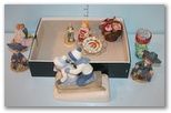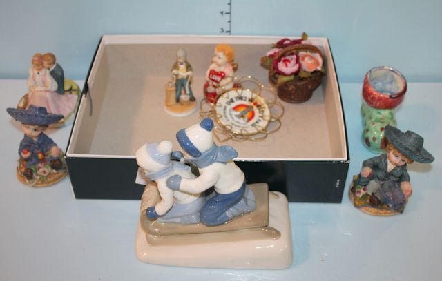 Group of Figurines, including; DGC Norman Rockwell Figurine "Flowers in Tender Bloom"; Kelvin 1982 "Stock Broker", kids sledding figurine, miscellaneous small figurines Group of Figurines, including; DGC Norman Rockwell Figurine "Flowers in Tender Bloom"; Kelvin 1982 "Stock Broker", kids sledding figurine, miscellaneous small figurines