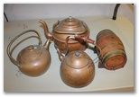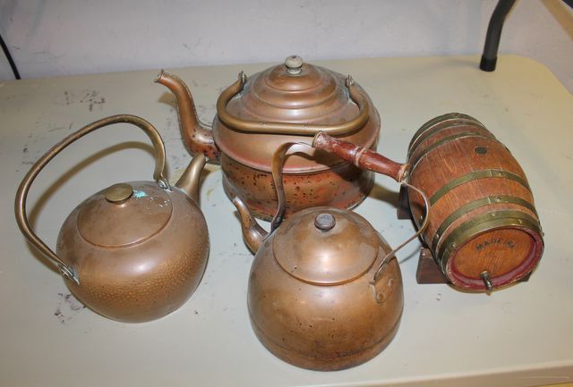 Three Copper Tea Kettles along with Small Wooden Whiskey Barrel in Holder Three Copper Tea Kettles along with Small Wooden Whiskey Barrel in Holder