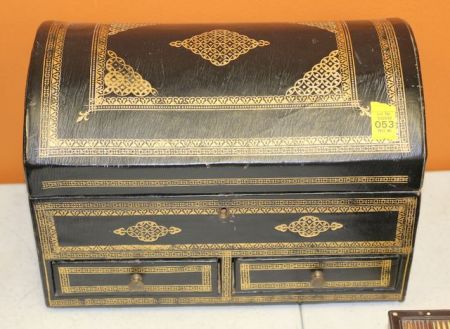 Embossed gilt design, lift top and two lower drawers, has key, 12"w., 8"d., 9"h. Embossed gilt design, lift top and two lower drawers, has key, 12"w., 8"d., 9"h.