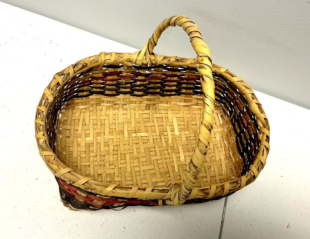 8 1/2"h., 10"w.Choctaw Hand Woven Cane Gathering Basket, single handle, rivercane, good condition. 8 1/2"h., 10"w.Choctaw Hand Woven Cane Gathering Basket, single handle, rivercane, good condition.