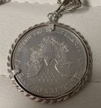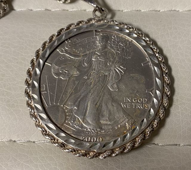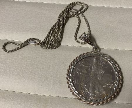 2000 American Eagle Coin, .925 sterling Bezel pendant & necklace, 1 oz. fine silver, good condition. 2000 American Eagle Coin, .925 sterling Bezel pendant & necklace, 1 oz. fine silver, good condition.