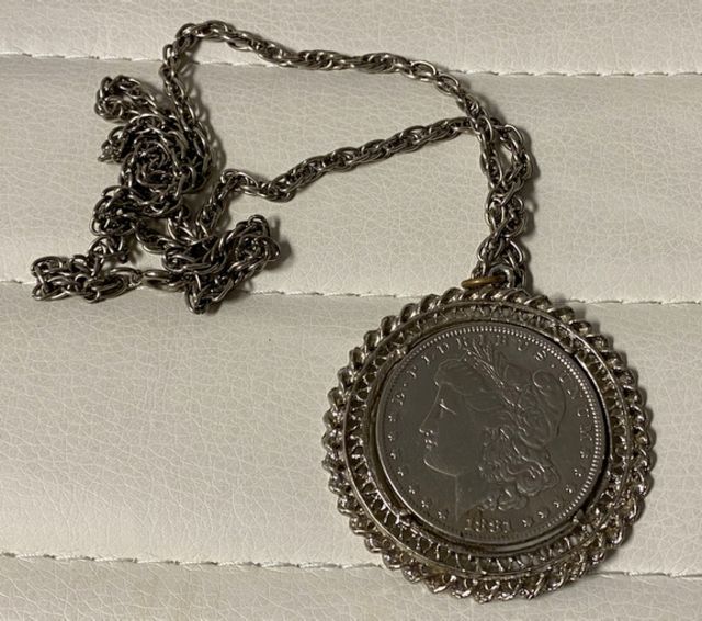 1881 Morgan Silver Dollar, bezel pendant necklace with link chain, good condition. 1881 Morgan Silver Dollar, bezel pendant necklace with link chain, good condition.