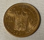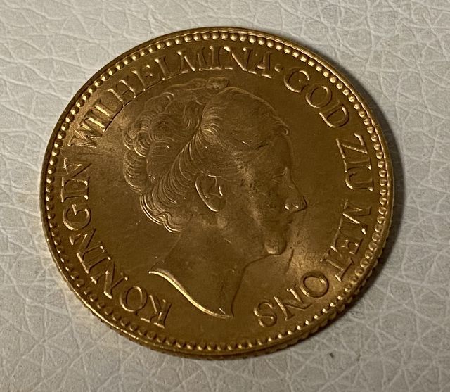 1932 10 Gulden Wilhelmina, Koningin Wilhelmina God be with us, Gold .900, dia. 22.5mm, 1.2mm, round. 1932 10 Gulden Wilhelmina, Koningin Wilhelmina God be with us, Gold .900, dia. 22.5mm, 1.2mm, round.