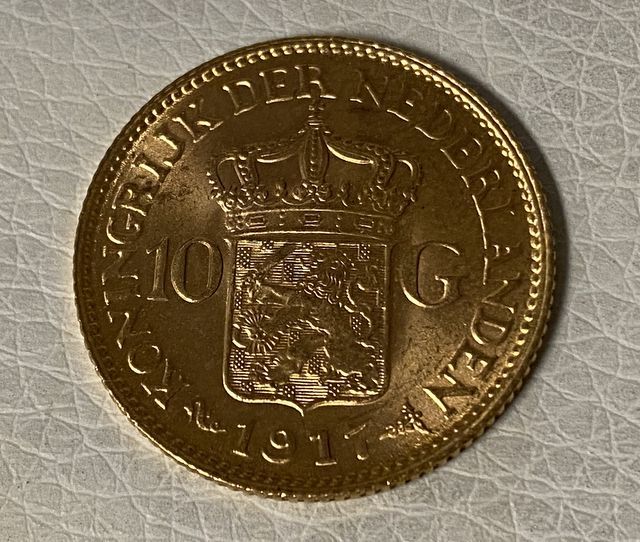 Netherlands 10 Gulden 1917, Queen Wilhelmina, Gold .900, reeded, round, dia. 22.4. Netherlands 10 Gulden 1917, Queen Wilhelmina, Gold .900, reeded, round, dia. 22.4.