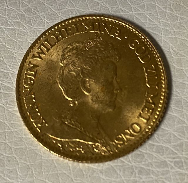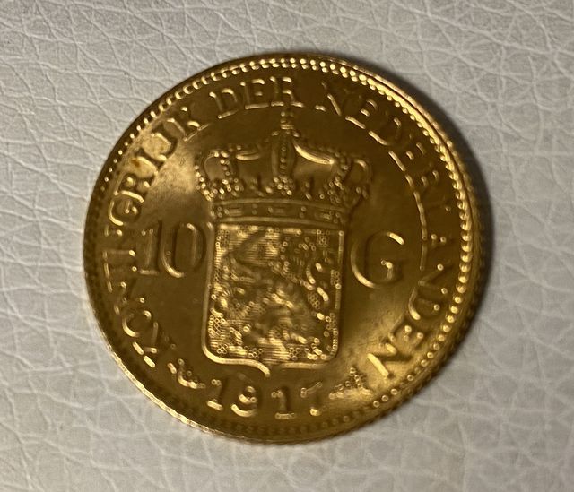 Netherlands 10 Gulden 1917, Queen Wilhelmina, Gold .900, reeded, round, dia. 22.4. Netherlands 10 Gulden 1917, Queen Wilhelmina, Gold .900, reeded, round, dia. 22.4.