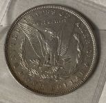 1898 Morgan Silver Dollar AU, Philadelphia, plastic case. 1898 Morgan Silver Dollar AU, Philadelphia, plastic case.