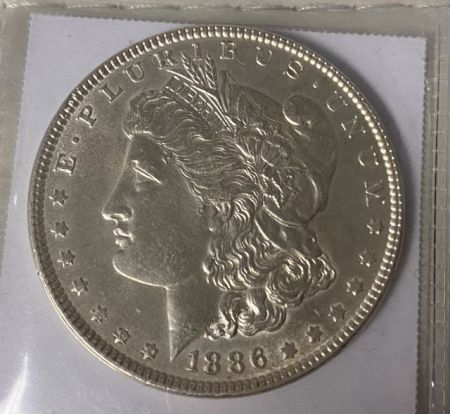 1886 Morgan Silver Dollar MS, Philadelphia, plastic case. 1886 Morgan Silver Dollar MS, Philadelphia, plastic case.