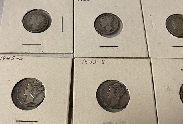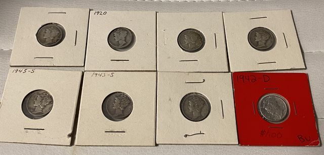 8 Mercury Dimes, 1942-D, 1945, 1943-S, 1945-S, 1942, 1935, 1920, 1939. 8 Mercury Dimes, 1942-D, 1945, 1943-S, 1945-S, 1942, 1935, 1920, 1939.