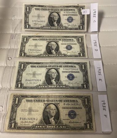 Four $1 notes, 1935C, 1935D, 1935E, 1935F, good condition. Four $1 notes, 1935C, 1935D, 1935E, 1935F, good condition.