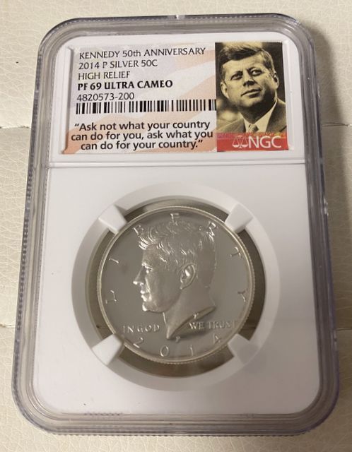 2014-P Silver Kennedy Half Dollar, 50th Anniversary High Relief PF 69 Ultra Cameo. 2014-P Silver Kennedy Half Dollar, 50th Anniversary High Relief PF 69 Ultra Cameo.