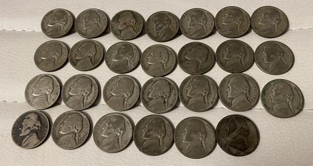 27 Jefferson Nickels, 12-1943 D, 15-1943P, average condition. 27 Jefferson Nickels, 12-1943 D, 15-1943P, average condition.