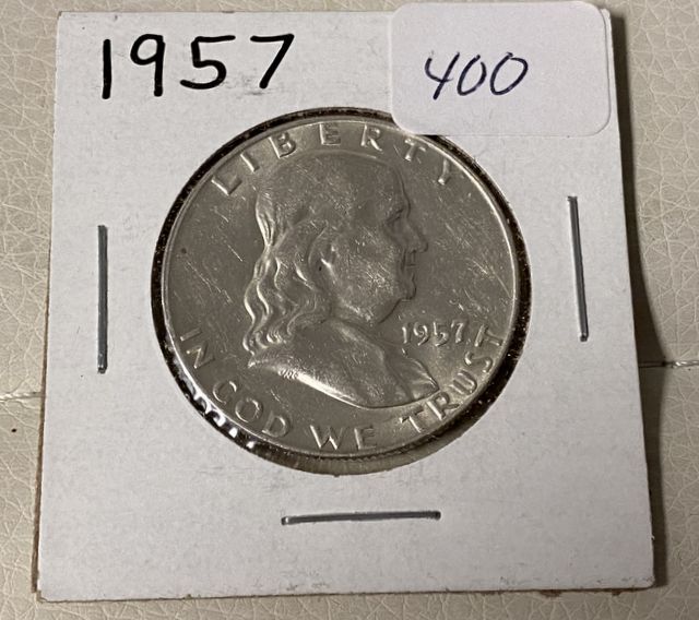 1957 Franklin Half Dollar, vg condition, paper case. 1957 Franklin Half Dollar, vg condition, paper case.