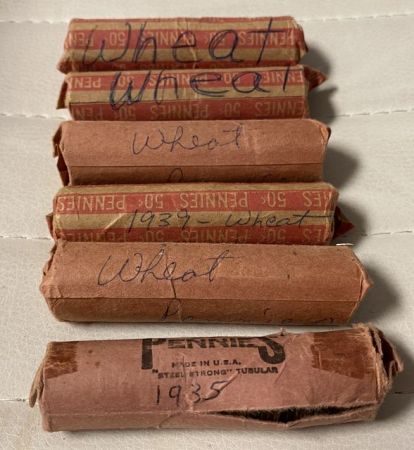 Six Rolls of Wheat Pennies, one 1935, one 1939, average/good. Six Rolls of Wheat Pennies, one 1935, one 1939, average/good.
