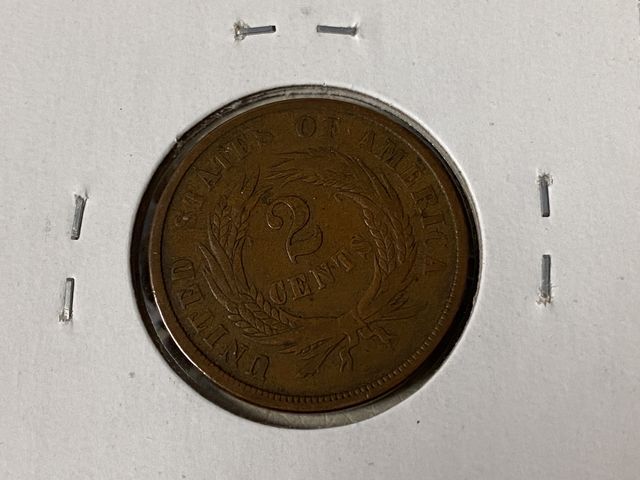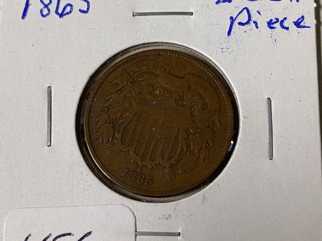 1865 2 Cent piece, fine condition, paper case. 1865 2 Cent piece, fine condition, paper case.