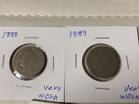 1887, 1888, and 1889 Liberty "V" Nickel, 1888 very worn, 1889 very worn, paper cases. 1887, 1888, and 1889 Liberty "V" Nickel, 1888 very worn, 1889 very worn, paper cases.