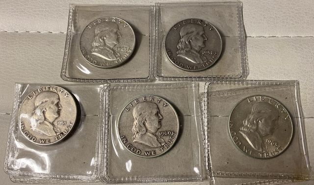 Five Franklin Half dollars, 1951, 1963, 1958, 1960, 1965, in plastic cases. Five Franklin Half dollars, 1951, 1963, 1958, 1960, 1965, in plastic cases.