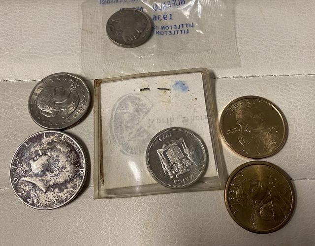 Jamaica 1973 Proof, 1936 Buffalo Nickel, 1974 Kennedy Half Dollar, 2000 D and 2000 P Sacagawea Dollar Coins, 1979 Susan B Ross Dollar Coin. Jamaica 1973 Proof, 1936 Buffalo Nickel, 1974 Kennedy Half Dollar, 2000 D and 2000 P Sacagawea Dollar Coins, 1979 Susan B Ross Dollar Coin.