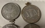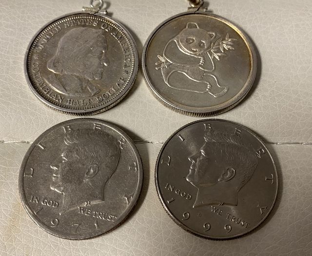 Columbian Half Dollar with bezel, The International Trade Unit .999 fine silver with bezel, two 1971, 1999 Kennedy Half Dollars. Columbian Half Dollar with bezel, The International Trade Unit .999 fine silver with bezel, two 1971, 1999 Kennedy Half Dollars.