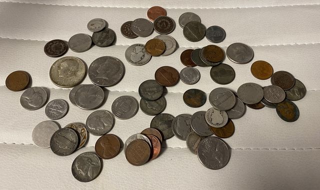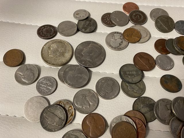 Group of miscellaneous coins, v nickels, nickels, buffalo, Kennedy half dollars, some silver quarters, dimes, pennies, few wheat. Group of miscellaneous coins, v nickels, nickels, buffalo, Kennedy half dollars, some silver quarters, dimes, pennies, few wheat.