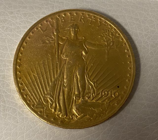 1910 $20.00 Saint Guadens Gold Coin, 34.00 millimeters, 90 % gold, lettered edge, very good condition. 1910 $20.00 Saint Guadens Gold Coin, 34.00 millimeters, 90 % gold, lettered edge, very good condition.