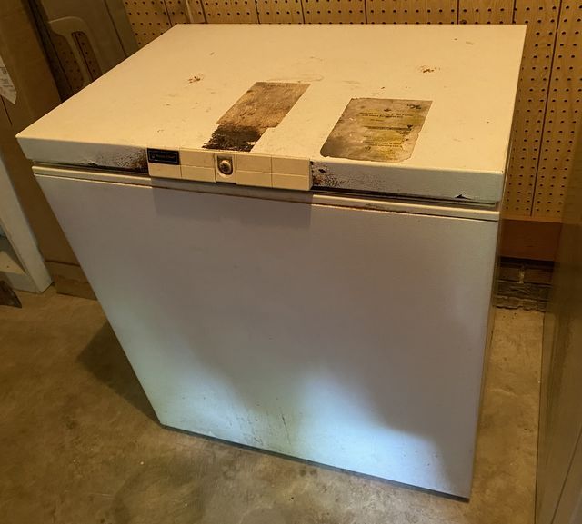 Vintage chest freezer, age wear, working condition. Vintage chest freezer, age wear, working condition.