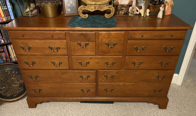 Keller Co. Oak Dresser, double dresser, with back dressing mirrors, Chippendale style, good condition. Haverty's Keller Co. Oak Dresser, double dresser, with back dressing mirrors, Chippendale style, good condition. Haverty's