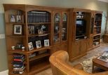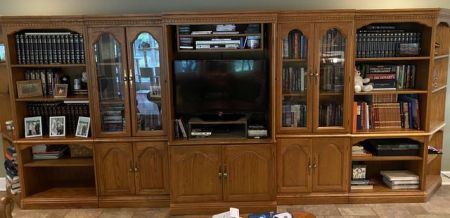 Large 7 Piece Entertainment Bookcase Set, pressed oak wood, corner pieces, bookcases, glass door cabinets, entertainment armoire, good condition. Large 7 Piece Entertainment Bookcase Set, pressed oak wood, corner pieces, bookcases, glass door cabinets, entertainment armoire, good condition.