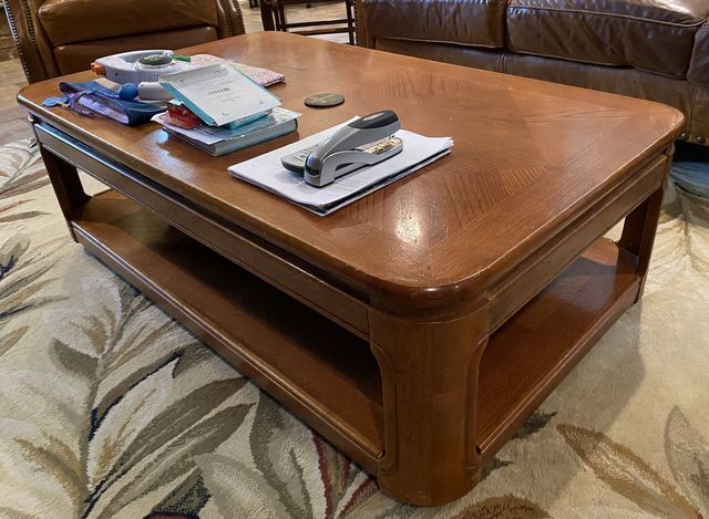 Modern Oak Two Tier Coffee Table, rectangle, light finish wear. Modern Oak Two Tier Coffee Table, rectangle, light finish wear.